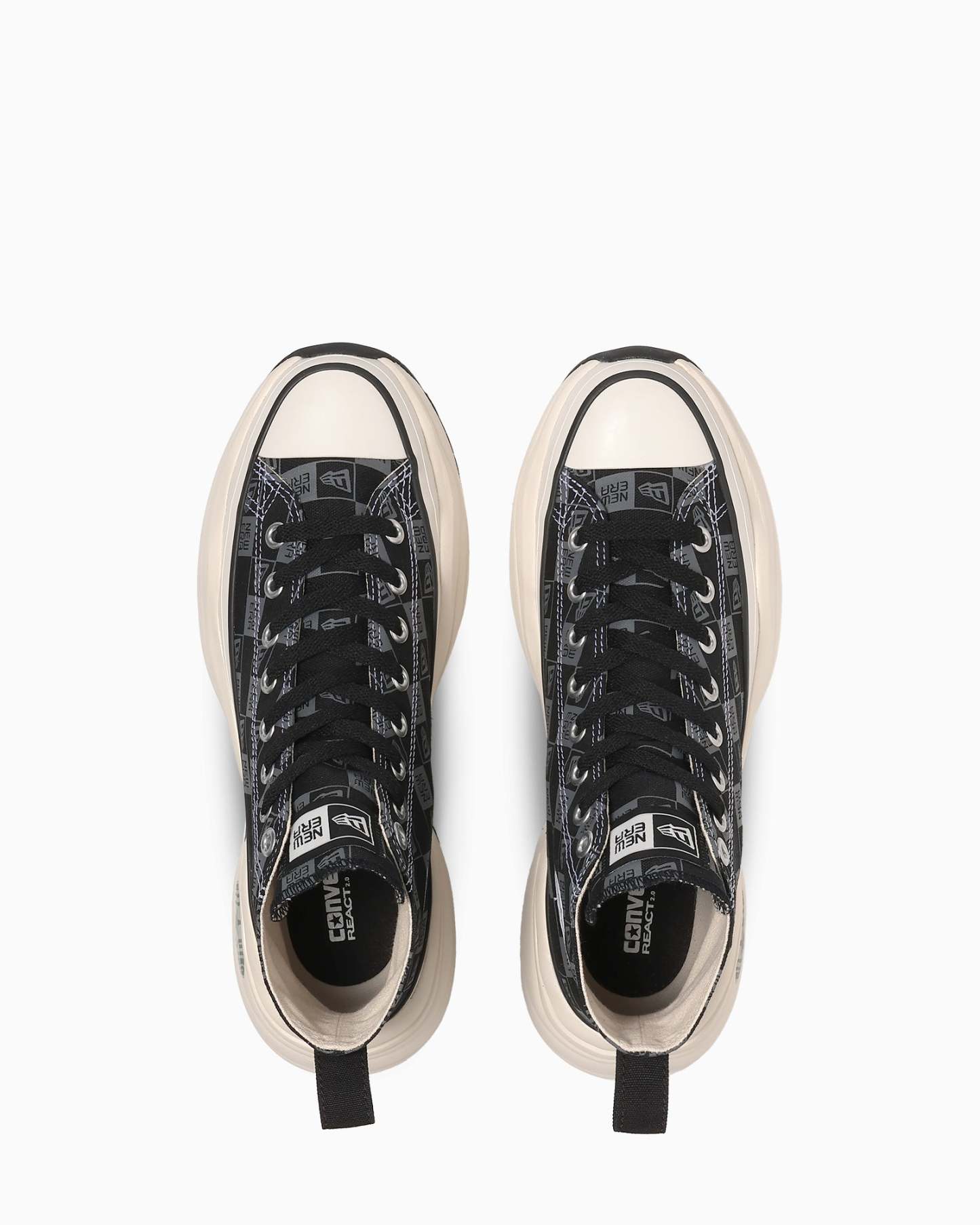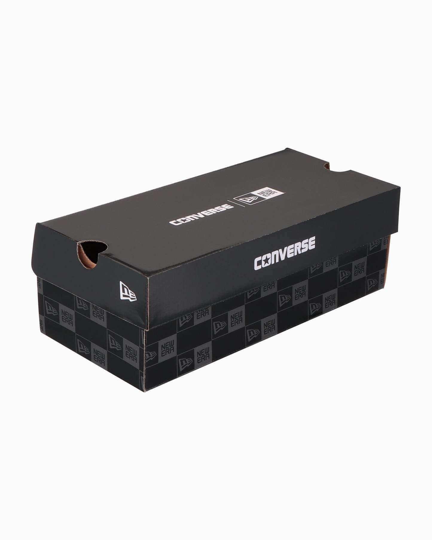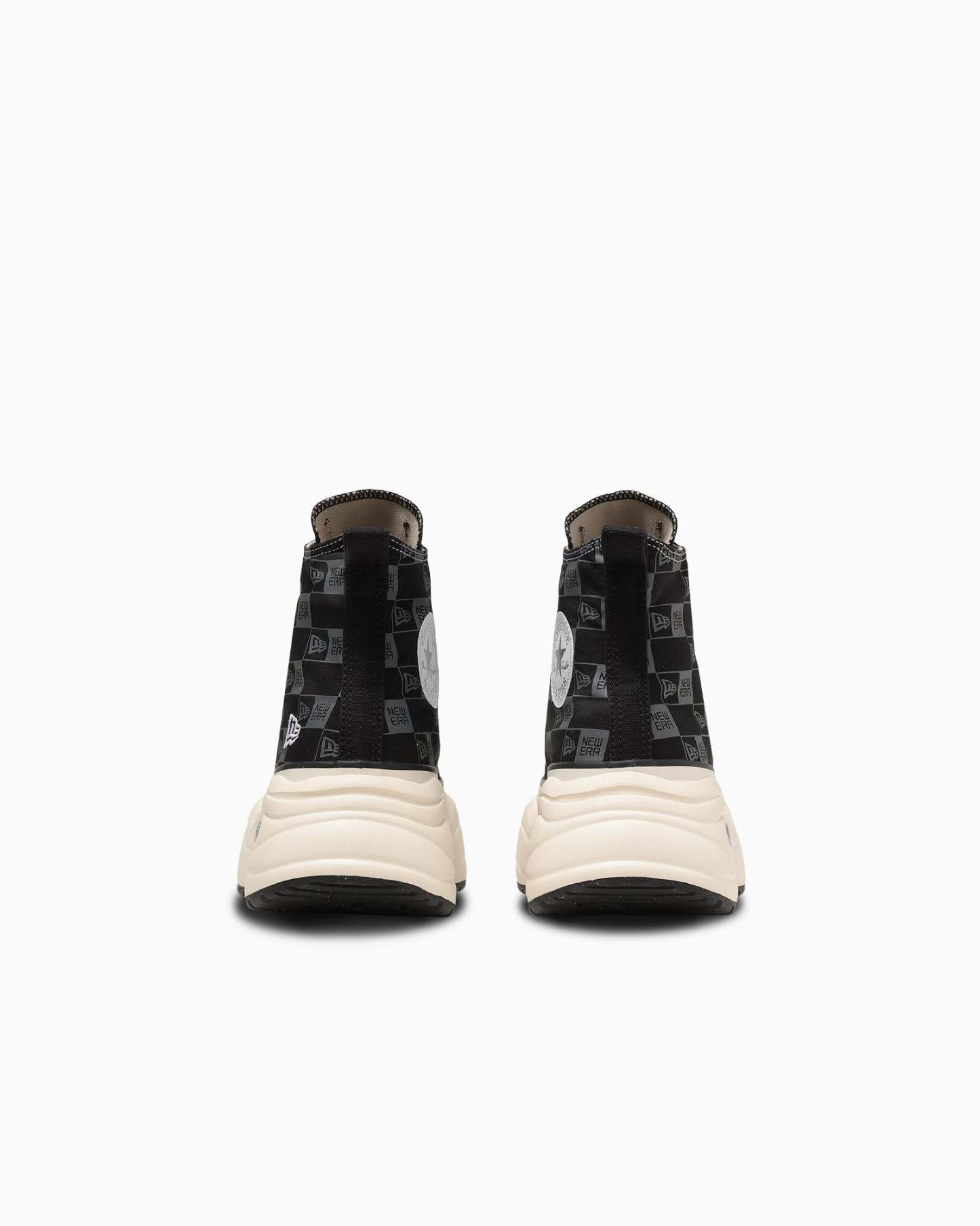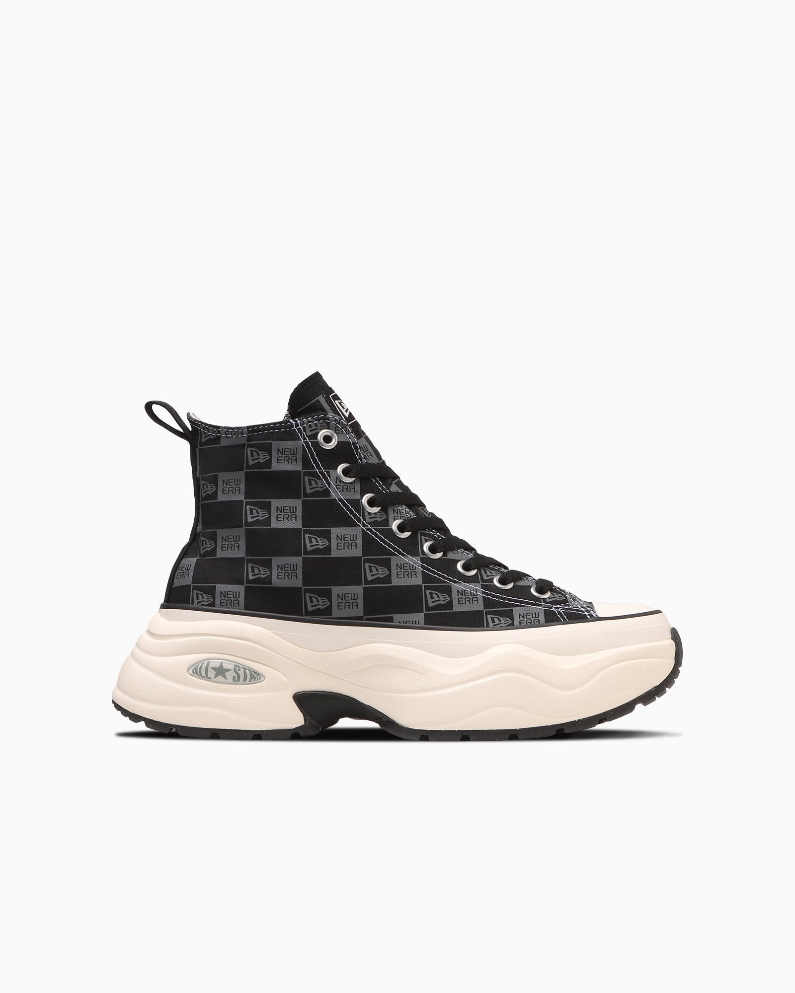 ブラックのアッパー全面にNEW ERA®のボックスロゴをダークグレイでプリントし、インソールやアウトソールまでブラックで統一したストリートテイストなデザイン。