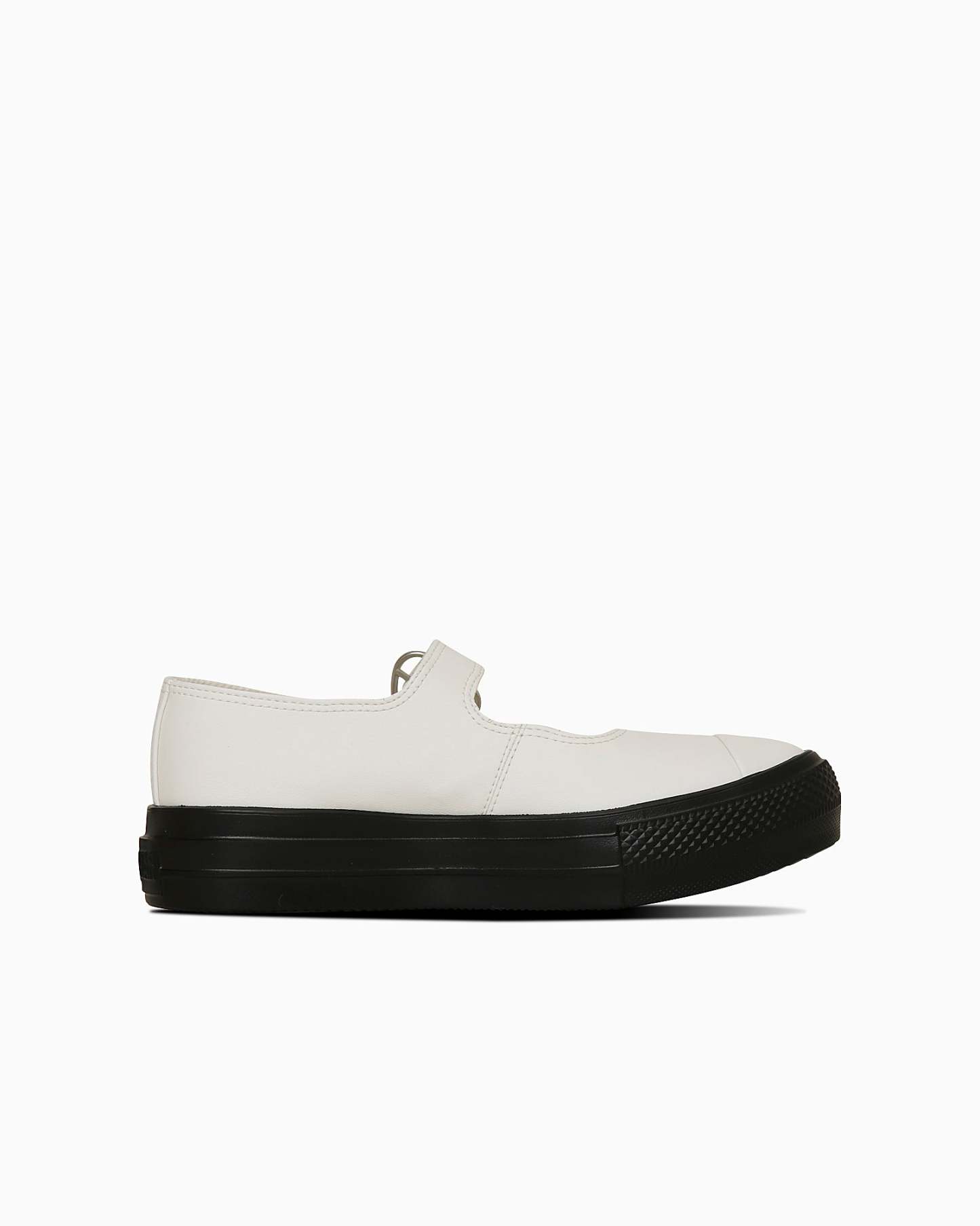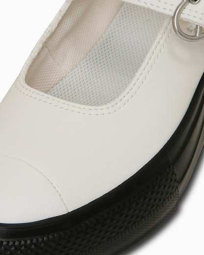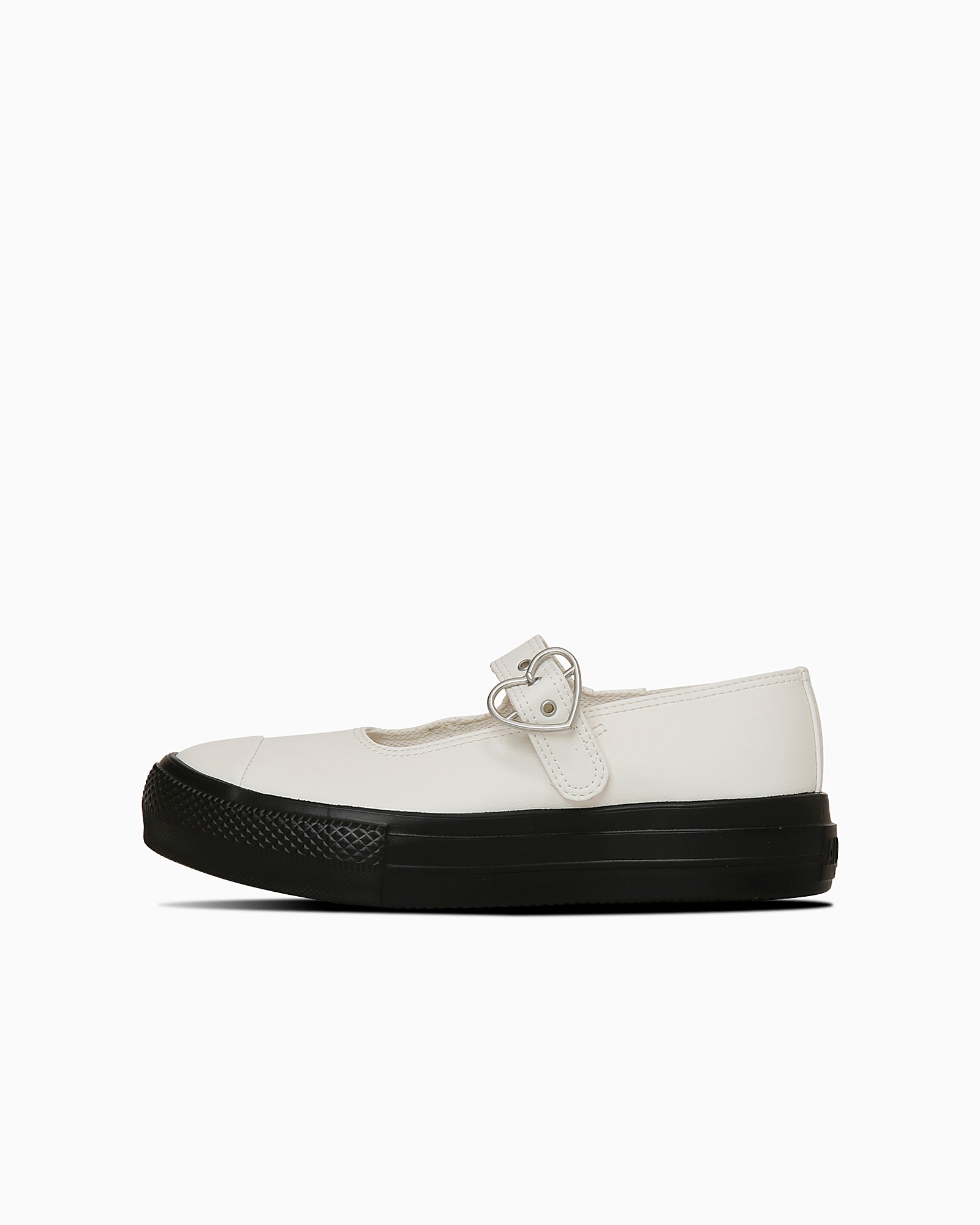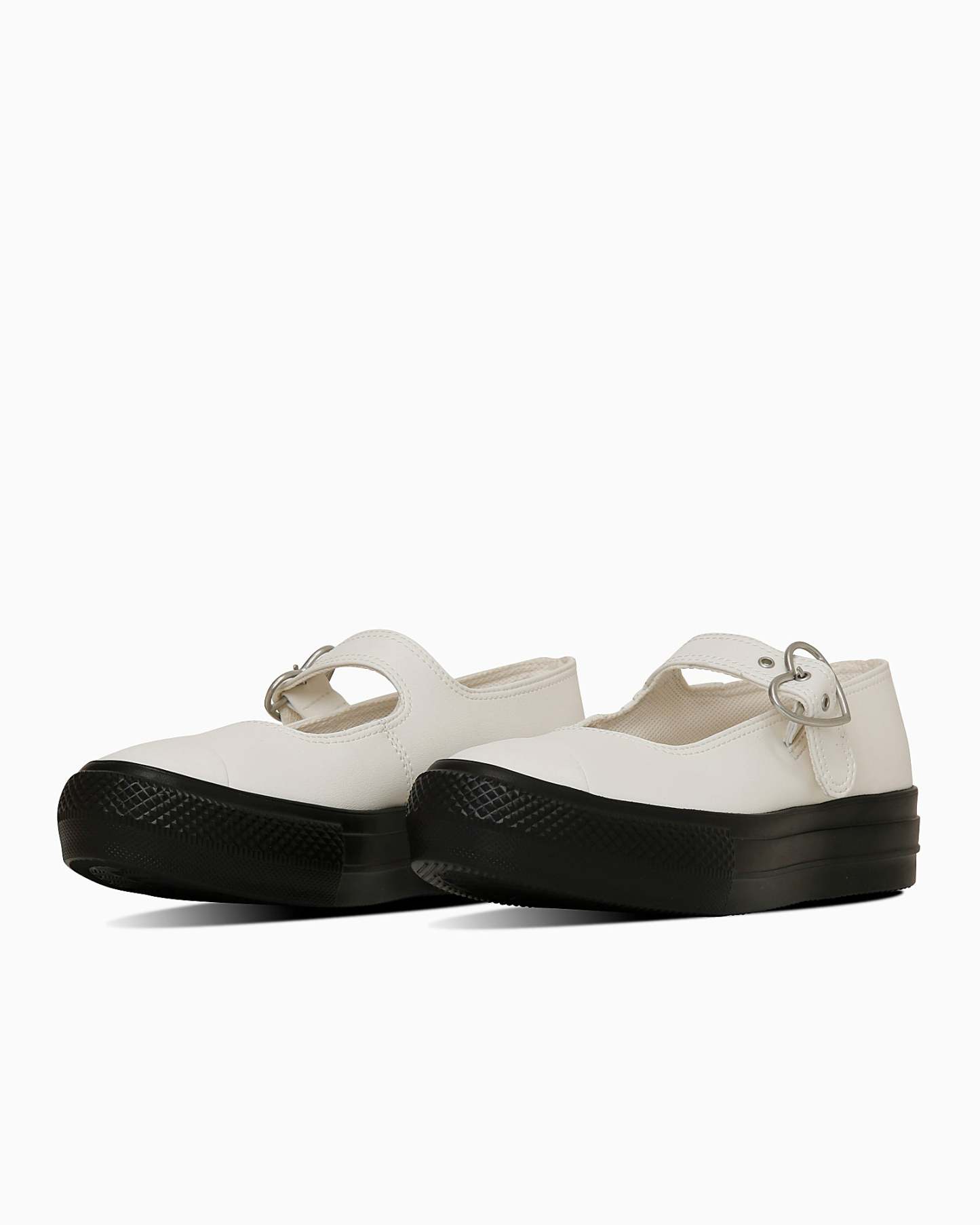 甲が大きく開いたメリージェーンと厚底を掛け合わせ、ハートバックルを採用したキュートなデザイン。