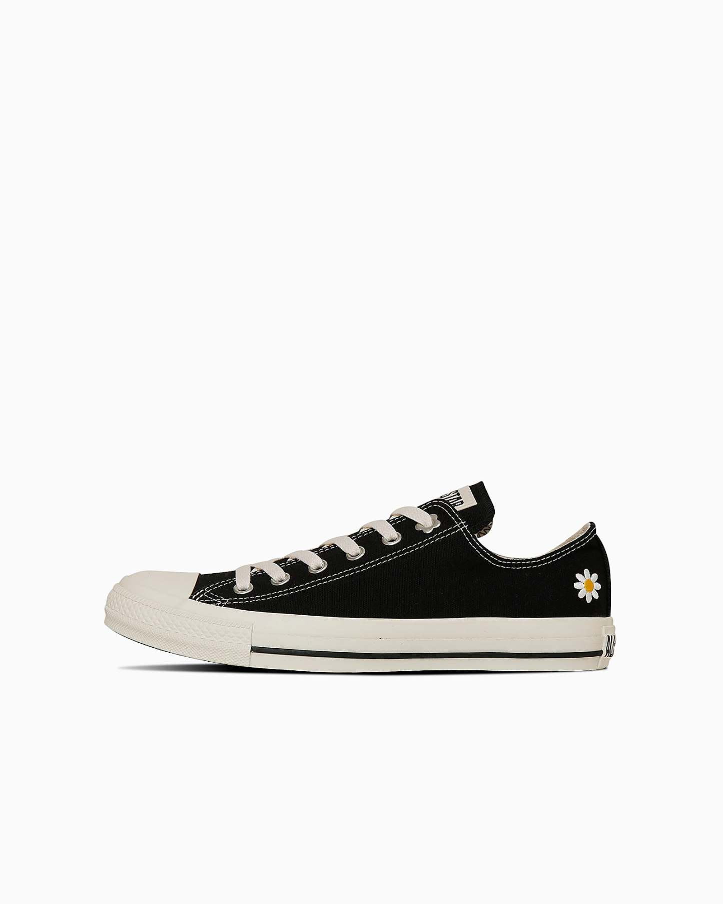 フラワーモチーフを第一ハトメ部分に採用し、踵部分にはデイジーの刺繍をあしらったデザインがポイント。