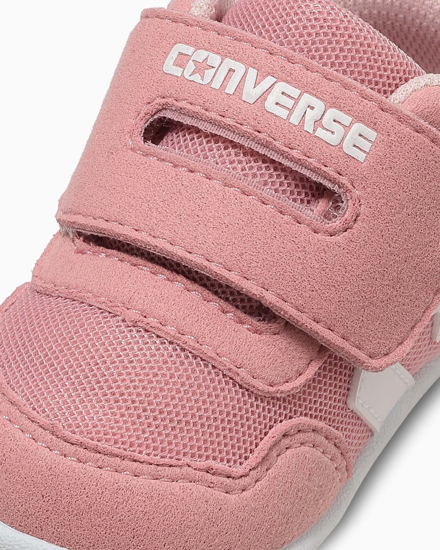 タンがしっかり開くワンベルトタイプに、踵ループ付きで履かせやすいデザイン。