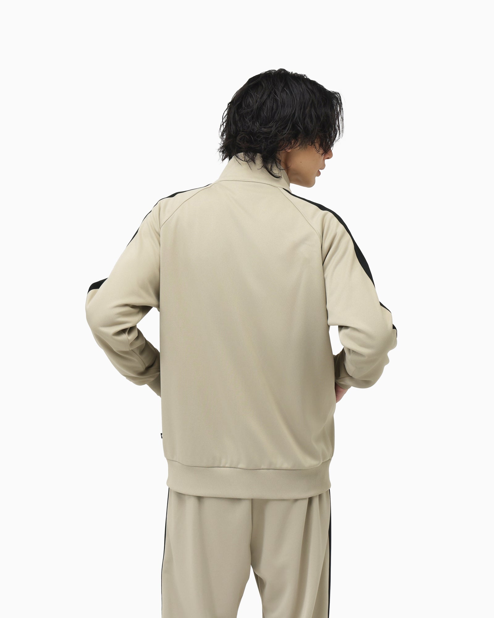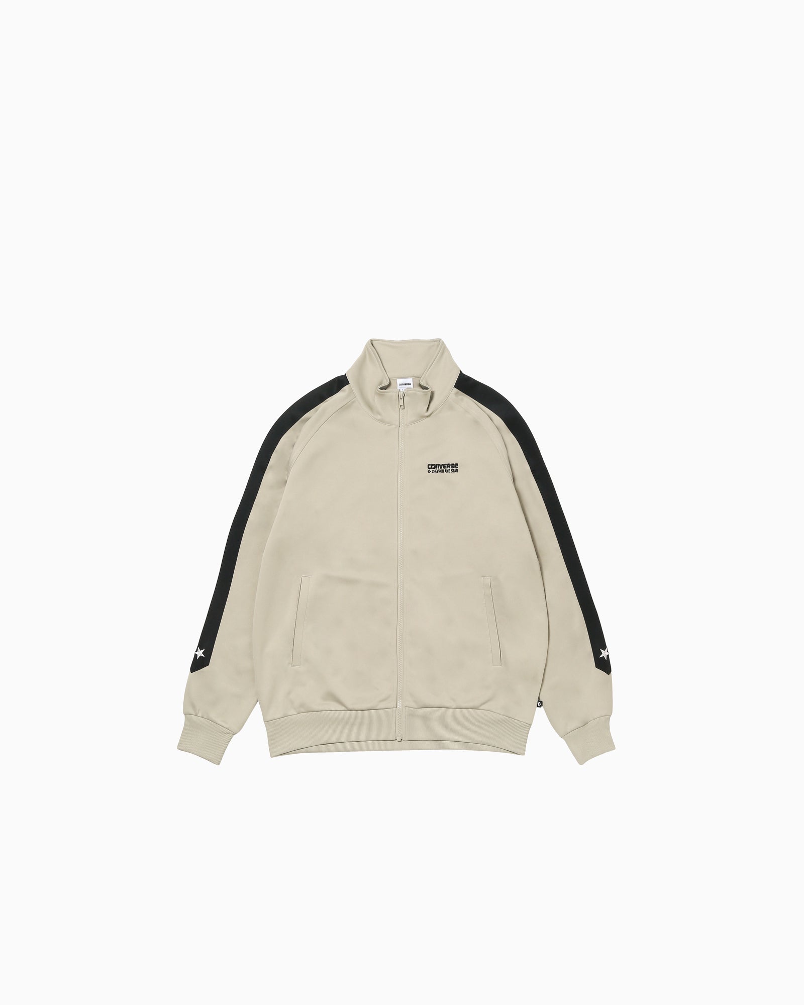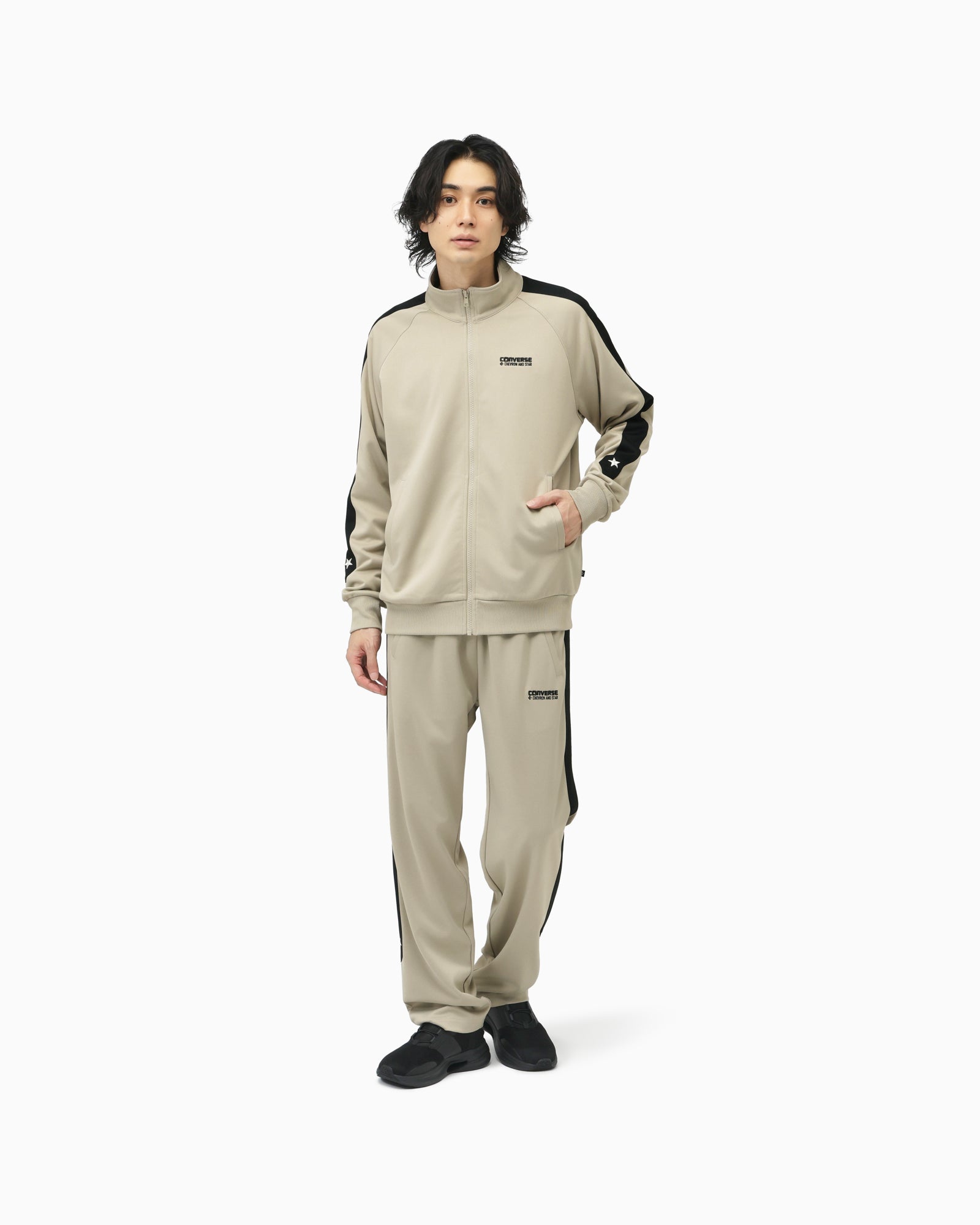 吸汗速乾性能を備えたジャージ素材のトラックジャケット。肩から袖にかけてシェブロン&スターのロゴをイメージしてデザインされたカッティングがポイント。とセットアップで着用可能。【品番】40100230(ウォームグレー)40100231(ダークブラウン)40100232(ブラック)