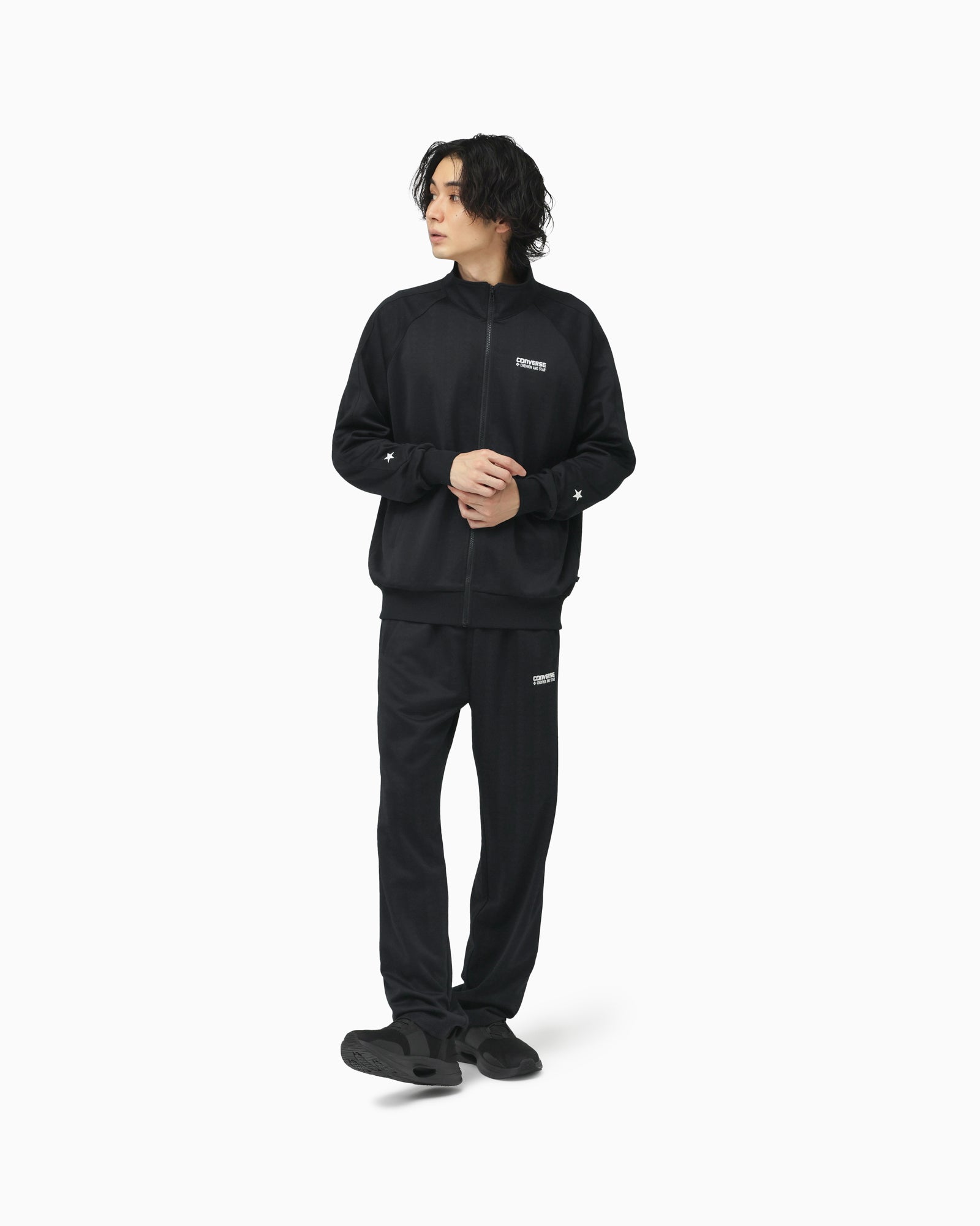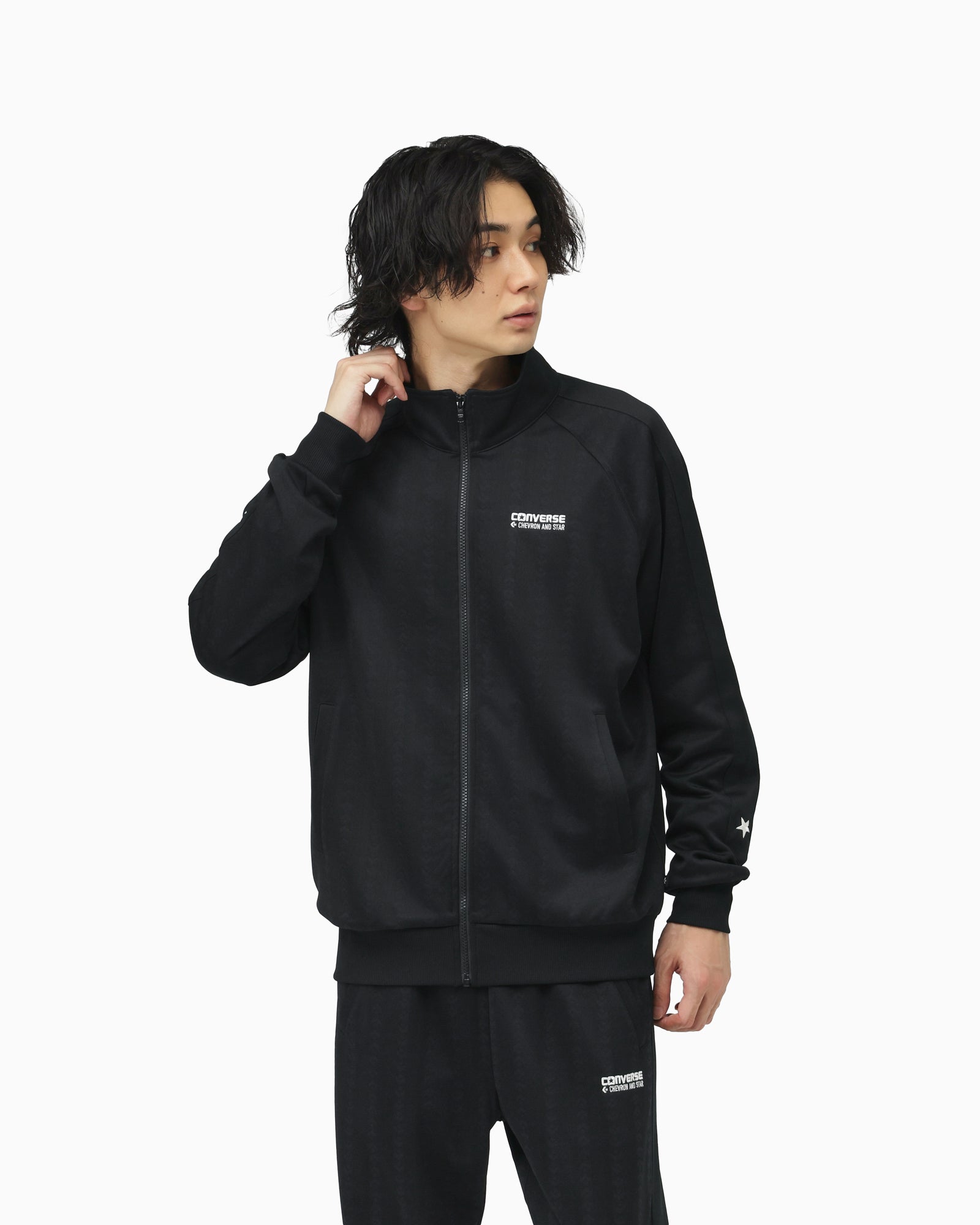 吸汗速乾性能を備えたジャカードのジャージ素材を採用した、トラックジャケット。肩から袖にかけてシェブロン&スターのロゴをイメージしてデザインされたカッティンがポイント。とセットアップで着用可能。【品番】 40100240(ブラック)