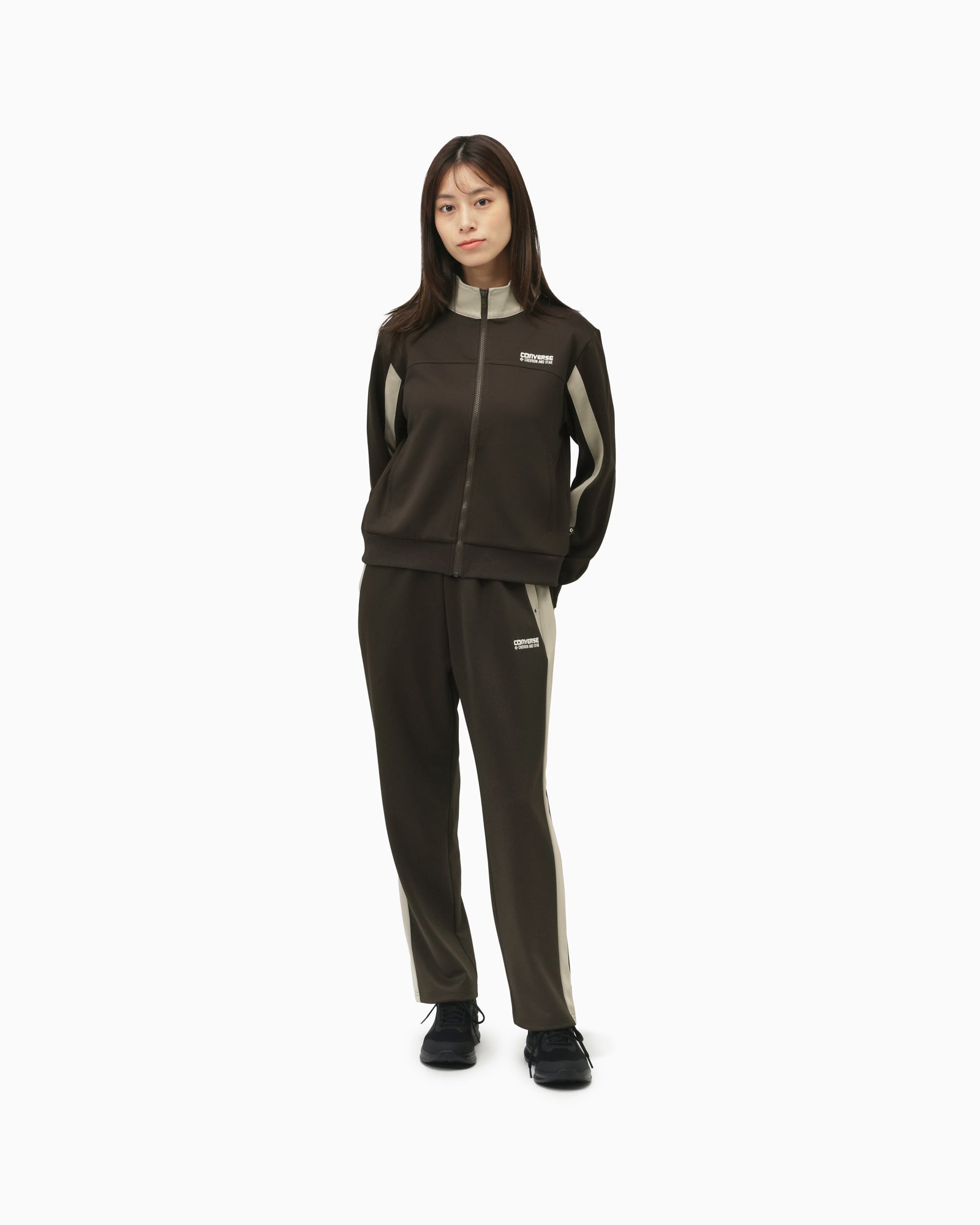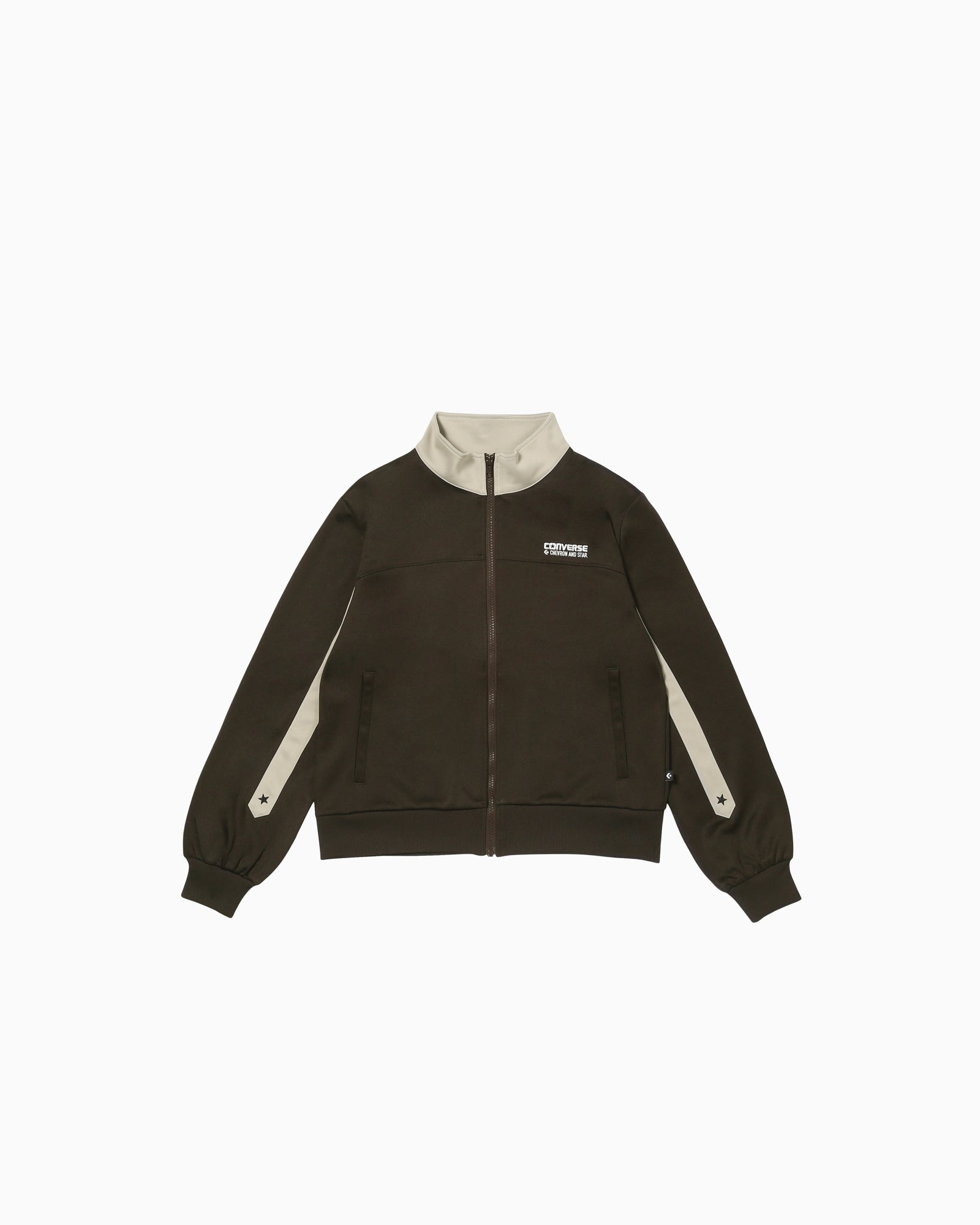 吸汗速乾性を持つポリエステル素材を採用したトラックジャケット。袖部分の切りの角度をシェブロン&スターロゴの角度と同じ角度にし、星の刺繍をシェブロン&スターロゴと同じ大きさにしたデザインがポイント。、とセットアップで着用可能。【品番】42100100(ウォームグレー)42100101(ダークブラウン)42100101(ブラック)