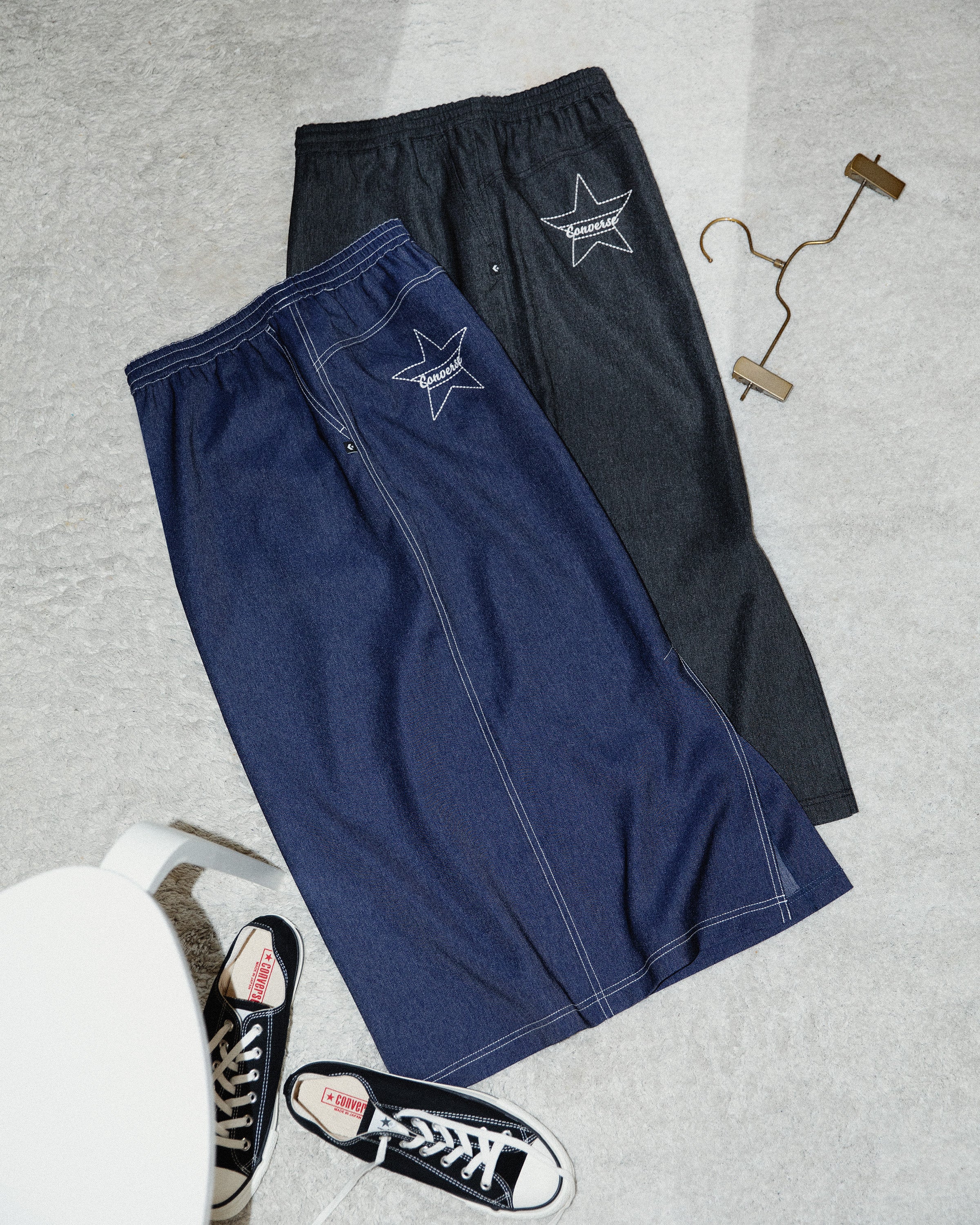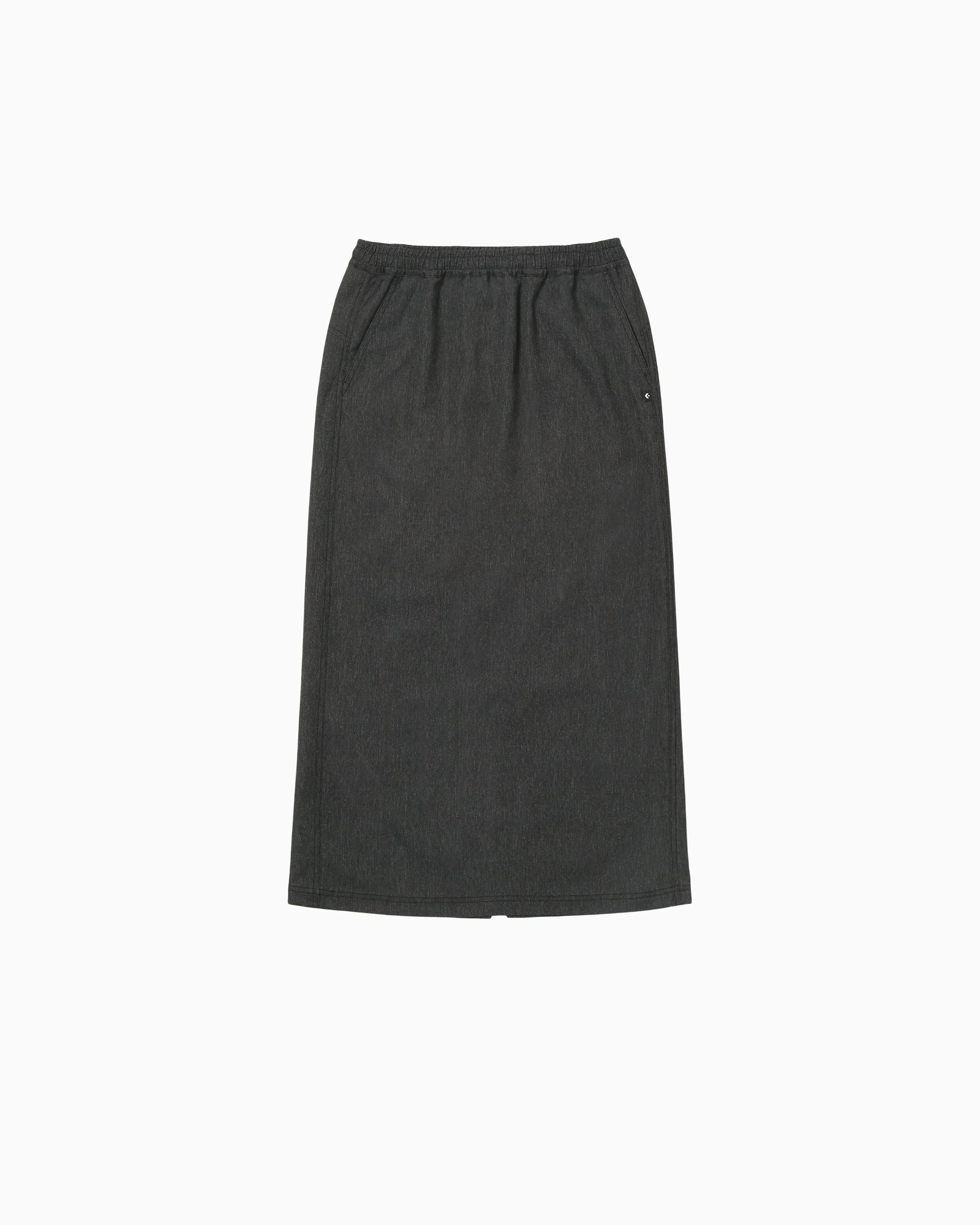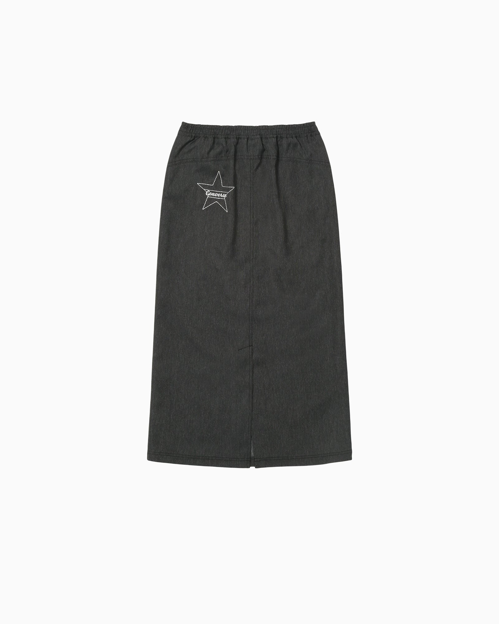 撥水機能、ストレッチ性のあるポリエステル素材を採用したスカート。デニムライクな素材とステッチのデザインでデニムらしいデザインに。ウエスト部分は総ゴム仕様。後ろヒップ部分にステッチ刺繍で施された、星とCONVERSEロゴがポイント。とセットアップで着用可能。【品番】42500080(ネイビー)42500081(ブラック)